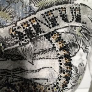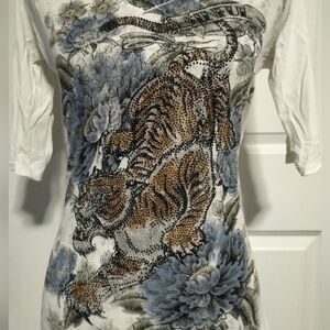 It has beautiful pattern of a Tiger on it with crystals all over it with flowers around it