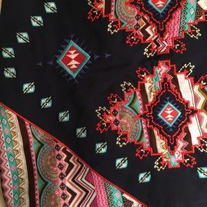 New without tags! Gorgeous navy blue mini skirt with multicolor abstract/tribal print designs covering the front! Part spandex so skirt has some stretch! Zipper on the side. Waist is 16 inches across (flat lay) but does have stretch. 15.5 inches long. Would fit 8-12 in my opinion.