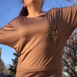 Adorable brown tunic top. Real pocket. It's a large but runs a tad small as it fits my teen pretty well and she's a solid medium!! π ππ