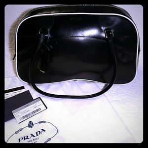 Authentic black bowler bag with contrasting white piping. Buttery soft calfskin leather. Like new, rarely used. 2 tiny dirt spots on bottom of bag that can be easily cleaned (I'm just too scared to do it). Dustbag, certificate of authenticity, lock with instructions and keyring included. 13"x8"x5".
