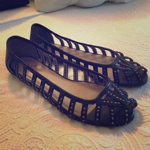 Size 7, black leather with little studded details, super cute! Bought them at 344, don't think I ever wore them out of the house! In basically brand new condition !