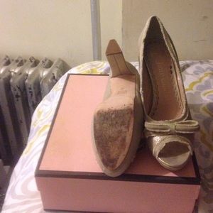Juicy couture gold color heels. I wore these shoes once. Minor wear on one shoe shown in the last pic. You can't notice it at all. Cute peep toe.