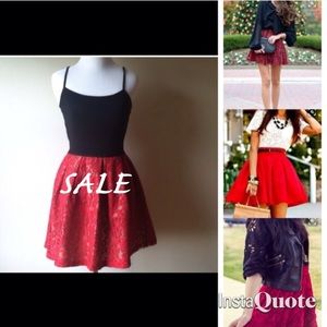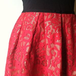 This is such a cute skirt! Red lace skirt over a layer of gold fabric then black tulle. Size small.