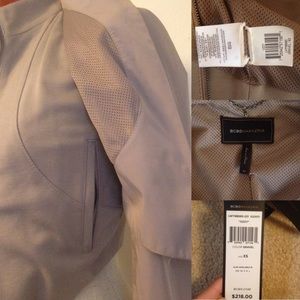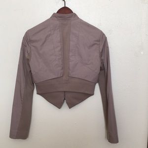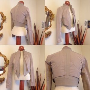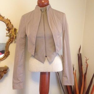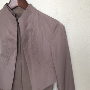 TAUPE color. I LOVE this jacket- now it's too small for me. Layered front - first inside layer zips and has pockets. TWO-TONE-MATERIAL SLEEVES - inside the sleeves are cotton and a little stretchy. XS but can fit SIZE SMALL. 💕MAKE OFFER. Accurate color reflects in first four pictures. It’s a little too purple in last four.
