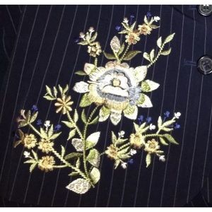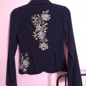 The blazer is navy with white pinstripes. It has embroidered flowers on the front and back.