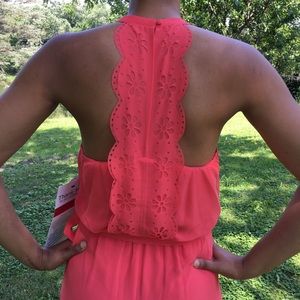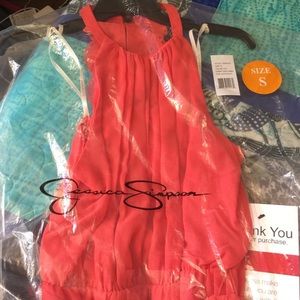 New with tags! Beautiful coral pink maxi dress by Jessica Simpson πΈ Size small available. Shown modeled on women's size 4/6, standing 5'8". 100% polyester. Elastic waist with sash tie. Button closure on back. Approximately 60" long