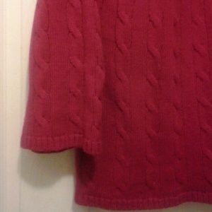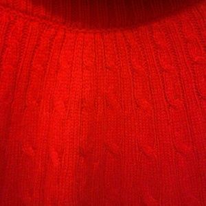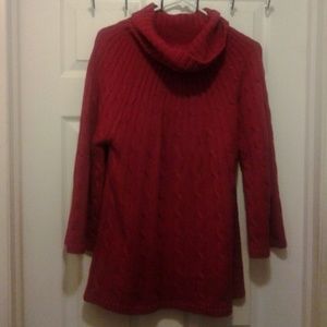 Cheery Licorice Red cowl nek Acrylic sweater by Alfani. Cable knit and width of the actual sweater increases in size from neckline to hem. Wrist openings and waisrt are approximately 1 inch wide knit banded. Broomstick style spread to the entire sweater with approximately 8 inch fold over cowl neck.