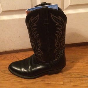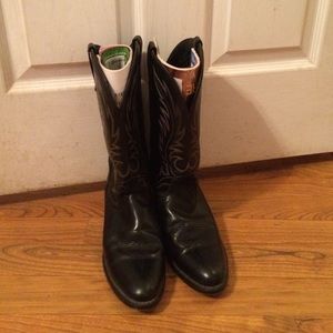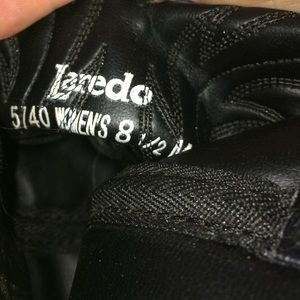 Laredo's women's cowboy boots with point toe. Black, the leather had been cleaned. They are broken in to where they are comfortable and have been lightly worn enough to break them in. The right boot has a small nick in the leather on the toe, not very noticeable.