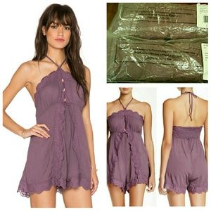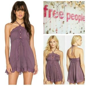 Free People Ruffle Romper in washed plum. Embrace your feminine side in this free People ultra girlie sleeveless romper! Boasting an embroidered cascading front ruffle that trails to the scalloped hem with a flirty peekaboo keyhole at bust!