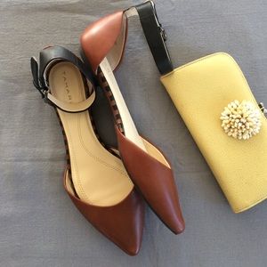 Excellent new condition leather flats in rich brown and black. Ankle straps and a 1/2" heel.