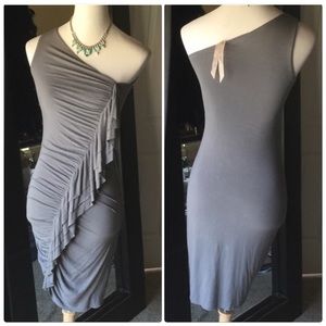 Bailey 44 one shoulder grey dress with beautiful front ruffle. Form fitting to show off those beautiful curves Measures 38" from shoulder to bottom hem. Great condition. Dress has lots of stretch