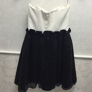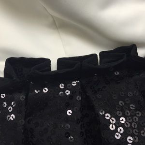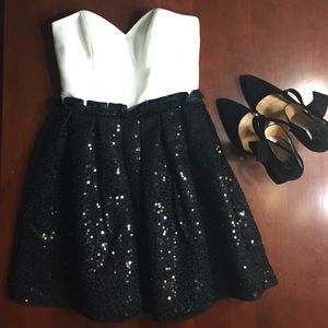 Flattering and fabulous Betsey Johnson Evening dress. Strapless with a off white satin bust and sweetheart neckline. Skirt is a full style covered in black sequins and pleated. Zips down back. Only worn a few times, in great condition.