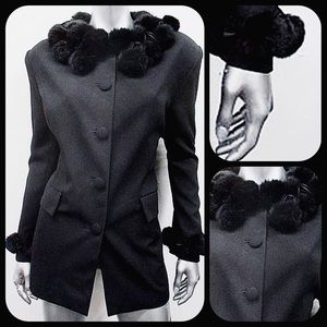 Elegant black dress jacket trimmed in Marabou feathers and black satin rosettes. What a superb design with the Marabou feathers and black satin rosettes are a design element at the collar and cuffs. This crepe fabric jacket has five covered buttons going down front, two front flaps and is lined in black acetate-blend fabric. Lying flat measurements are length 28", sleeves 25", waist 21 1/2" armpit-armpit 23". Designer label removed at auction