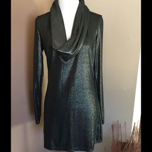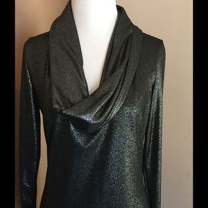 π Gorgeous long sleeved ! Cowl neckline ! Black that sparkles with silver ! 93% polyester 7% spandex ! Wash delicate cold, dry flat. Easy ! About 32 inches in length ! My mannequin is size 2 - 4 and it fit fine ! Made in USA πΊπΈ
