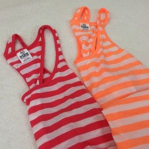 Super comfy razor back tanks in a fun striped print! Both tanks are identical with one in bright orange & the other in dark pink. Perfect to lounge around in! Cotton/Polyester. Only worn a couple of times and in excellent condition! 🚫Trades/PP