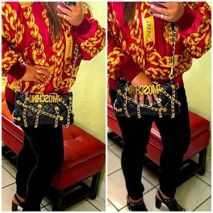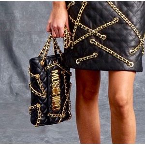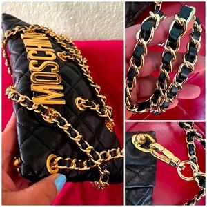 👑✅PRICE FIRM✅NO OFFERS SUPER SALE!! 👑AUTHENTIC Moschino Leather Large Clutch Multichain Bag. Very good clean used condition. All Gold Hardware is shiney throughout! 2 Gold Brass Ball Studs with D-Rings were added to the top of the clutch to give a crossbody option with use of gold Non-branded chain strap. Strap is removable. You may add any other kind of strap to suit your style and/or hand care as a clutch only, which makes this Gorgeous bag versatile. Intricate gold chain details all over. Definitely a show stopper and rare find!🔥🔥🔥Interior is clean. Exterior soft supple leather with minor scratch scuff marks hardly noticable. Please review all photos and video carefully before purchasing. All sales final! No returns accepted on this item purchase. No dustbag. No box.