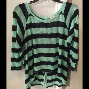 Super soft dark blue and light green striped sweater with buttons down the back. The back is longer than the front. 3/4 length sleeves. Looks great with a tank top, leggings and boots. Like new. #0128