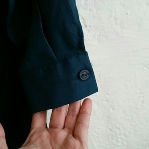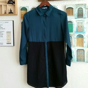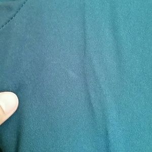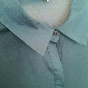 The color on the first pic makes it seem blue, but the true color is shown in the 2nd pic, it's more of a forest green/ Approximately 16 inches from armpit to armpit/ 32 inches long/There is a small white mark by the right armpit, but it's light, not noticeable at all/ This can be worn as a dress or a shirt/ I wore it as a dress with tights/ 100% polyester, feels silky-satiny & is semi sheer