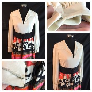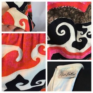 Miss Bullock cotton Barkcloth Wave Skirt with Jersey knit Bodice. Preowned nice condition. The skirt is an Amazing Print with little wear. Mild pilling snags on bodice. Waistband missing middle hook for eye. Small wear at crease of hem