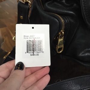 Badgley Mischka Black distressed leather handbag from the Janet collection style 950766 (I still have the original tag). This bag has a strap on the top to allow you to carry it as a handbag or you can use the chain to carry it in your shoulder or as a Crossbody (or take the chain off entirely). It has two cute little pockets on either side outside, two small pockets inside, and a zippered compartment. The leather looks distressed. There is some scratches on the turn lock, see pic.
