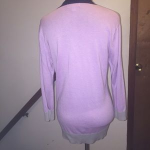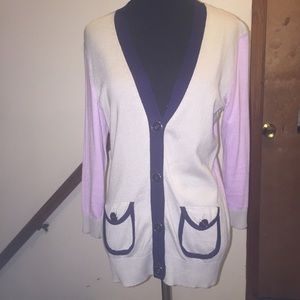 This cardigan is color blocked with purple and grey. It has purple and silver buttons. It has two pockets in the front. It is 3/4 sleeves.