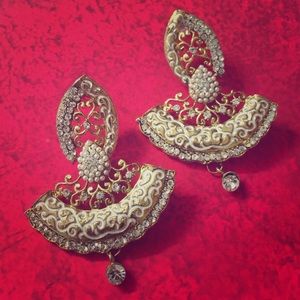 Gorgeous Bollywood fan shaped drop earrings, great for formal occasions like weddings, prom, sweet 16, etc. Stylish and classy and elegant. Post backs. Accented with rhinestones and pearls on a gold tone frame with filigree designs. One of a kind boutique style. Length = 3 inches.