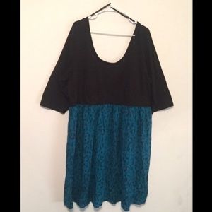 Black and teal leopard print 3/4 sleeve stretchy dress - torrid 4. Plus size. bottom is rayon and top is cotton spandex. 40 inches long from shoulder to hem. Sleeves are 17 1/2 inches long. Waist is approx 42 inches. Tag reads Torrid 4.