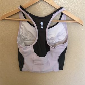 Dry-Fit lilac colored with built in bra body is 88% polyester, 12% spandex, 85% mesh polyester, 15% spandex bra, 81% nylon, 19%, bra cups 82% polyester, 8% spandex.