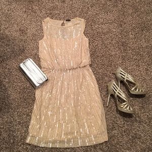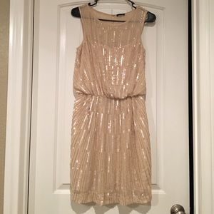 This champagne colored dress is a real winner! Beautiful sequin and beading designs! Missing a few beads on the sides but not even noticeable. Blouson style for a flattering fit, split opening in the back with zipper closure, as shown in photo. This is a great holiday party dress, prom dress, or glamorous date night dress! Has a Gatsby feel to it!