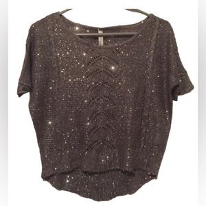 Absolutely great sweater with sparkly sequins. Very light lace like material. The front is a little bit shorter then the back. Pictures don't give it justice. No flaws! Extremely beautiful in person. Size small. Only one one time.