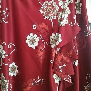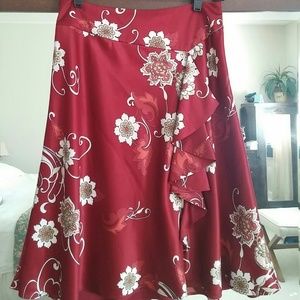 Beautiful deep red skirt with floral design, satin feel, swing bottom, off center ruffle detail, hits at knee