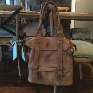 Hand finished full grain leather, dual handles, adjustable, detachable cross body strap, top zip closure, distressed leather. 16"Lx5"Dx14"H