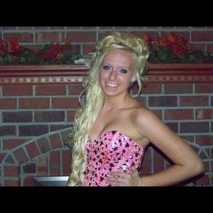 Beautiful homecoming, party, or short prom dress. Still in perfect condition only worn once. Size 5 but it has a corset back so smaller or bigger would probably fit. The top is more pinkish the bottom tulle is orange. I attached some pictures from the homecoming I wore the dress.