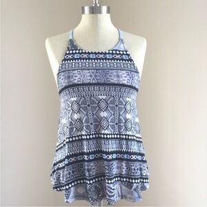 Light blue and black racerback tank from Wet Seal. Tribal/mandala print. Juniors size medium, could fit a small as well. Soft and flowy, great for summer or layered with a cardigan for fall! Never worn, excellent condition.