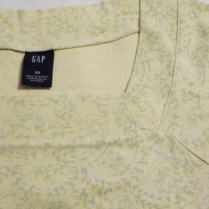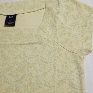 This VINTAGE GAP Shirt features a delicate yellow & green floral leaf pattern. Perfect for layering, or can be worn alone to compliment your fashion. Features a square neck & cap sleeves.