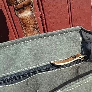 *This charcoal tote has a roomy interior and flat genuine leather straps. Zipper closure. *Material: Up-cycled truck tarps & military tents + canvas, genuine leather, antique metal hardware. 17" W x 17" H x 4" D | 12" Handle drop.