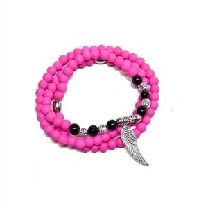 Neon pink wing charm bracelet. Nickel and lead free. Photo credit T&J Designs. Listing is for bracelet only. Stretchy. Can also be worn as necklace. Measures approx. 22".
