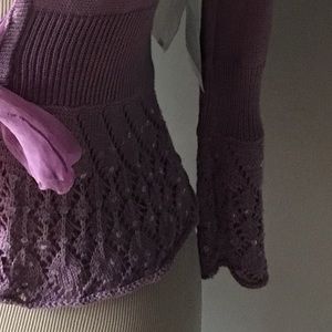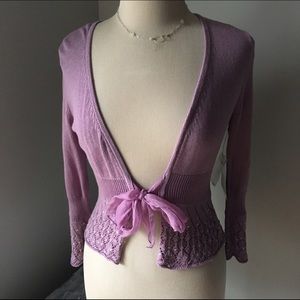 Ooh la la lavender. Perfect for spring. Amazing detail. Never worn. Hem and sleeves have iridescent small sequin. Tie is chiffon. Wear over a dress. Put a tank under to wear with jeans. Stunning in the sun. True to size. 60% rayon 40% cotton. And 19.5" long.