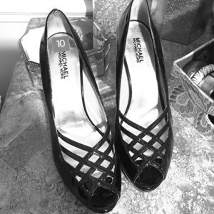 Black patent leather pumps. Michael Kors with front criss cross detail. Open toe platforms with gold Michael Kors hardware on the back upper heel.