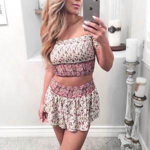 Amazing 2 piece set with a burgundy paisley print. The top is made of an elastic scrunch material. The bottom skort design has an elastic waist and flowy bottom. Super cute for festivals and concerts!!
