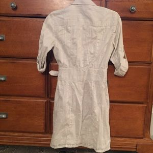 Lightest grey. Very faint stripe details running vertical. Easy for work or a spring day. Buckle waist detail. Zipper pockets. Snaps down front. Snaps to hold up rolled sleeves. Fashionable and effortless! Used. Size 2. Could fit a 0/1 maybe if pull the belt a bit tighter.