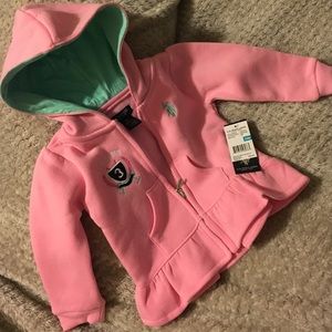 Brand New! Baby Pink & Baby Teal U.S. Polo Assn. 2Piece Sweatsuit. Long Sleeved Zip-Up Hoodie w/ Matching Sweatpants. Standard Polo Logo is Embroidered, Baby Teal in Color on Both Garments. Different Polo Logo is Also Embroidered over the Top Right of the Sweatshirt. Pockets also on Both Sides of the Sweatshirt for Additional functionality. Ruffled-Style Along the Entire Bottom for a Super Cute, Super Modern Look! Size 24Months. BNWT! 📬Same Day Shipping!
