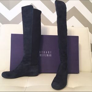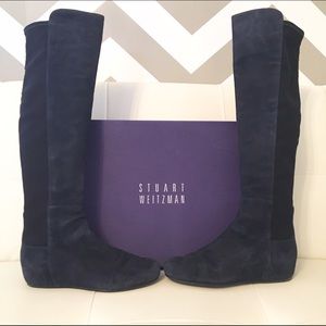 Navy suede Stuart Weitzman knee-high boots with black stretch material up the back. Slight wedge heel. Like new. Still has the box