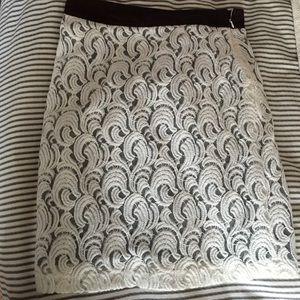 It's LOVELY. Dark brown band along waistline. Band is not stretchy. Fully Lined .15.5" across X 22" long. White/off white -more towards white in color. It's fitted but not butt-hugging. It is a perfect pencil skirt. Wear this with my anthropologie ticking striped jacket and a fitted tank underneath!