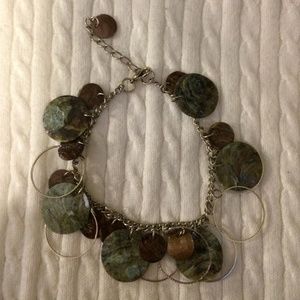 Silver shell bracelet. Larger shells have a natural blue tone, and the smaller shells are brown. Adjustable from 7.5 inches to 9 inches long. Never worn.