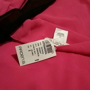 Beautiful pink tank with black ruffle detail at collar and an elastic ruched hem.
