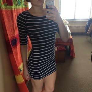 Blue and white striped bodycon dress that stops mid-thigh. 60% cotton, 35% polyester, 5% spandex. For reference: I am 5’5