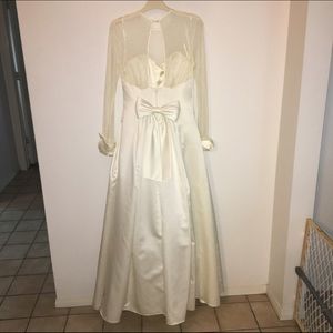 Vintage wedding dress from the early 90s! Gorgeous off white color with sheer sleeves and a sweetheart neckline and bow on the back. Kept in great condition over the years, only a few light colored minor stains that look like they'd easily come right out, but I haven't tried. Any other questions, feel free to ask!