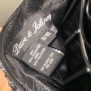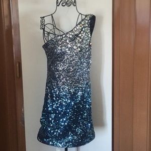 Worn once. Dave & Johnny Short Sequin Bejeweled Tarzan Should (one shoulder) strap dress. Zips closed on the side. Made out of polyester and lining is also polyester. Silver Ombré fading into a bluish color. It is a discontinued formal dress. Size 9/10. absolutely beautiful dress !