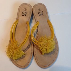 Yellow rubber pom-pom flip-flop thongs. Worn about a dozen times. Straps are a soft micro-suede material. You don't even really feel the pom-poms when you're wearing them, just a soft, feathery feeling. These shoes are so adorable! But I inherited a couple pairs and don't need that many! (I've also got bright pink, which I would be willing to sell instead of the yellow, just let me know😉) I'm open to offers and give bundle discounts!! 😊☮❣✌️